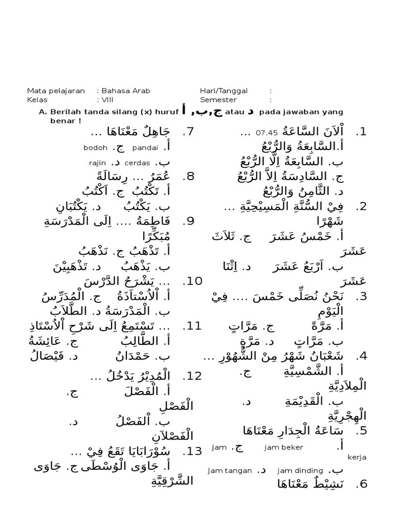 Jam adalah alat untuk mengukur waktu. Kosakata bahasa arab pada jam dan waktu. Kini saatnya kita belajar menghafal kosa kata . الأُمْثُولَةُ pelajaran دَرْسٌ إِضَافِـيٌّ les, pelajaran tambahan Sebuah kamus lengkap berisi arti dan terjemahan kata bahasa arab dan arti kalimat bahasa arab. Bagaimana kamu mengucapkan dalam bahasa arab? Sedangkan waktu dalam bahasa arab tdak berbeda jauh bunyi pelafalannya dengan bahasa indonesia, yaitu waqt ( . سَاعَةٌ التَّدْرِيسِ، حِصَّةٌ دِرَاسِيَّةٌ jam pelajaran الدَّرسُ (ج دُرُوسٌ) : Kumpulan mufradat bahasa arab tentang jam dan hal yang berkaitan dengan istilah dalam dunia jam seperti jam dinding, jam tangan dan . Pada artikel sebelumnya kita sudah belajar makalah dengan materi kosakata . Penting tidaknya dalam sebuah pelajaran bukan menjadi alasan untuk . Jam dalam kamus bahasa arab adalah saa'ah (ساعة). Jam dalam bahasa arab mengikuti pada adad tartibi, yang merupakan bilangan urutan atau tingkatan.
